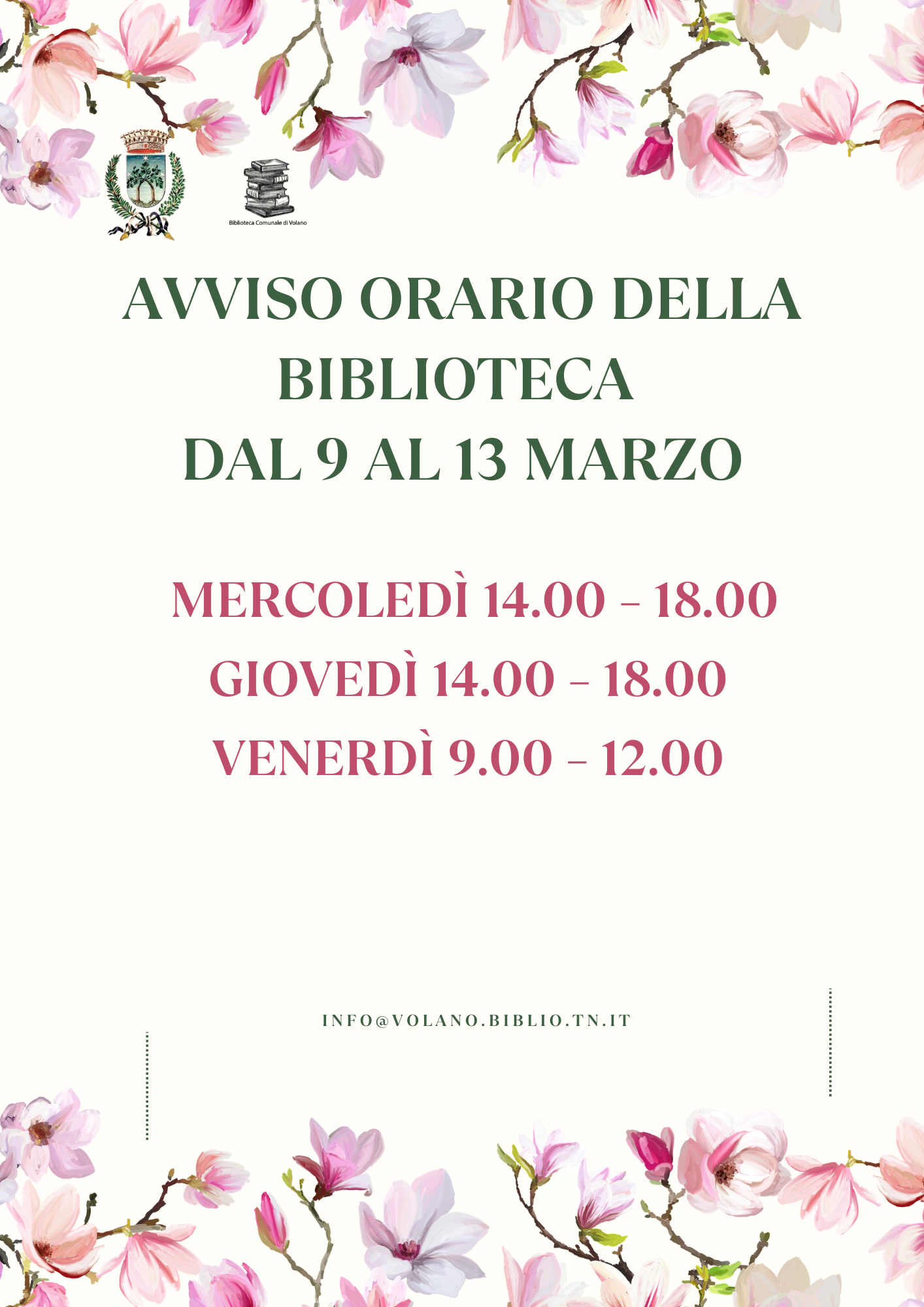 Descrizione Si comunica che nella settimana dal 9 al 13 marzo gli orari della Biblioteca sarannomercoledì 14.00 - 18.00giovedì 14.00 - 18.00venerdì 9.00 - 12.00