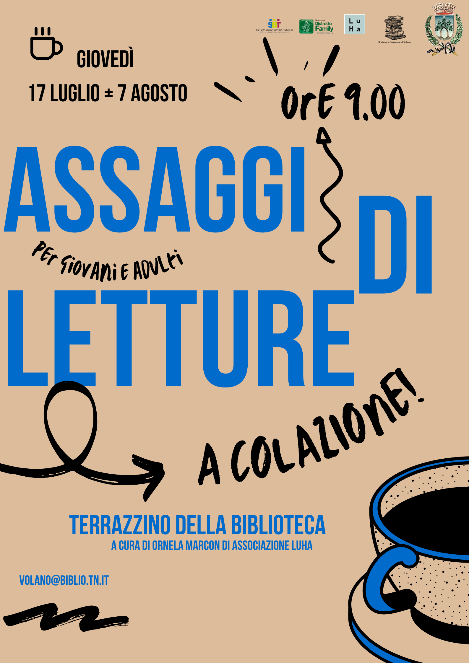 Accomodatevi, prendete un libro in prestito e trasformate le giornate estive in un viaggio indimenticabile: in Biblioteca a Volano vi offriamo qualche idea di lettura .... all'ora del caffè!Giovedì 17 luglio e giovedì 7 agosto alle 9.00 sul terrazzino della Biblioteca, vi aspettiamo!#bibliotecavolano