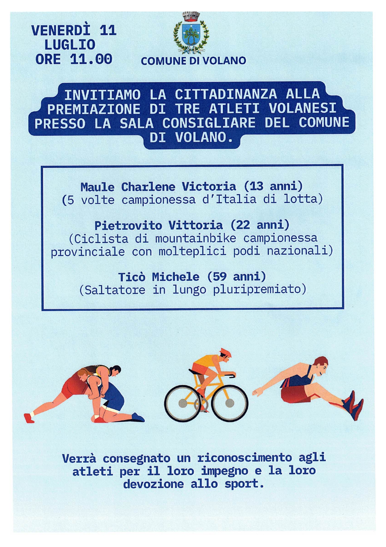 L'Amministrazione del Comune di Volano invita tutta la cittadinanza a partecipare alla premiazione di tre giovani atleti che si sono particolarmente distinti nelle loro discipline sportive, venerdì 11 luglio alle ore 11.00 presso la sala consiliare comunale.